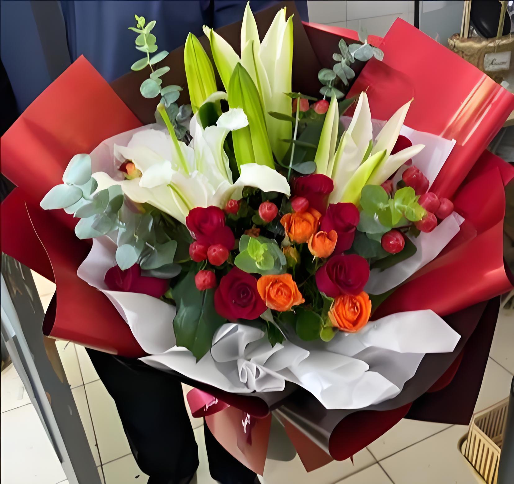 神农架花店包11枝红玫瑰、2枝多头白百合、6枝橙色多头玫瑰、红豆、尤加利叶包装:酒红色包装纸扇形包